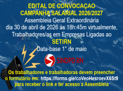 SINDPD/RN - EDITAL DE CONVOCAÇÃO, ASSEMBLEIA GERAL EXTRAORDINÁRIA, CAMPANHA SALARIAL 2026/2027, TRABALHADORES E TRABALHADORAS EM EMPRESAS DE TI, BENS E SERVIÇOS LIGADAS AO PATRONAL SETIRN. Pelo presente edital de convocação, à Diretoria do SINDPD/RN - Sindicato dos Trabalhadores em Empresas de Processamento de Dados, Serviços de Informática e Similares do Estado do RN, CONVOCAM todos os trabalhadores/as empregados/das nas empresas particulares de bens e serviços ligados à área de informática e ou tecnologia da informação (com exceção dos empregados em empresas de terceirização, uma vez que tem sindicato patronal específico – SINDPREST/RN), para Assembleia Geral Extraordinária. A assembleia será realizada virtualmente pela plataforma Google Meet. Os trabalhadores e trabalhadoras devem preencher o formulário em: https://forms.gle/coVeoHesroevX6St9 para receber o link e ter acesso a Assembleia, que ocorrerá no dia 30 de abril de 2026 às 18:45m (dezoito horas e quarente e cinco minutos) em primeira convocação e não havendo quórum mínimo em primeira convocação será realizada as 19h:15m (dezenove horas e quinze minutos), em segunda convocação com qualquer número de presentes virtualmente, para deliberar sobre os seguintes assuntos: 1- Leitura do Edital convocatório; 2- Discussão e votação acerca da aprovação da pauta de reivindicações a ser remetida à representação patronal (SETIRN - Sindicato das Empresas de Tecnologia da Informação do Estado do Rio Grande do Norte), visando efetivação da Convenção Coletiva de Trabalho para o período 2026/2027; ;3) - Autorização de desconto das Contribuições Sindicais (contribuição Sindical, Associativa e Confederativa), de todos os membros da categoria profissional, na forma dos Arts. 524, “e”, 548, “b”, 578, 579, 582, e seguintes da CLT, deliberar sobre a autorização prévia e expressa do desconto em folha da Contribuição Sindical a ser realizada na forma da decisão do STF (ARE 1018459 - tema 935), e da Nota Técnica n.º 02, de 26 de outubro de 2018, e Nota Técnica n.º 03, de 01 de março de 2019, ambas do CONALIS, autorizar o desconto da Contribuição Assistencial no percentual de 3% (três por centro) aplicado em uma única vez, sobre o respectivo piso salarial, limitado ao valor de R$ 130,00 (cento e trinta reais), imposta a todos os membros da categoria, associados e não associados, assegurando o direito de oposição à contribuição, a ser manifestado individualmente no prazo de 15 (quinze) dias, enviando e-mail para: financeiro@sindpdrn.org.br com o título: Carta de Oposição-SETIRN, a contar da data do registro do instrumento coletivo de trabalho no Sistema Mediador do MTE, considerando, ainda, a própria assembleia como fonte expressa e prévia de manifestação de vontade de toda a categoria profissional para efeito de autorizar desconto das contribuições em favor do SINDPD/RN, de acordo com o Art. 513, alínea “e’’ da CLT e o e o art. 8.º, inciso I, da CF/88, para atender os encargos sociais e fonte de manutenção, custeio e eficiência do SINDPD/RN; 4- Autorizar a Diretoria do sindicato (SINDPD/RN) para, em nome da categoria representada, entabular negociações e celebrar Convenção Coletiva de Trabalho diretamente com o Sindicato patronal (SETIRN), ou, se necessário, sob a mediação da Superintendência Regional do Trabalho no RN– SRT/MTE ou Ministério Público do Trabalho no RN, e, em caso de malogro nas negociações, instaurar o Dissídio Coletivo de Trabalho junto ao TRT21.ª/RN, bem como a instalação de processo grevista; 5- Decretar Assembleia Geral Permanente até o final do processo de celebração da Convenção Coletiva de Trabalho. As deliberações tomadas nesta Assembleia têm poderes deliberativos e prevalecerão para todos os fins de direito, e a ela se vinculam todos os trabalhadores pertencentes à base de representação sindical, sindicalizados ou não à entidade sindical convocante, independentemente de comparecimento a mesma. Natal/RN, 23 de abril de 2026. Alberto Lincoln de Lima – Diretor Presidente.
